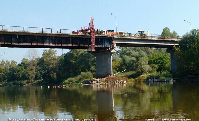 Мостъ Домачево-Славатыче во время капитальнаго ремонта. Видны сваи стараго деревяннаго моста 2016 г. |